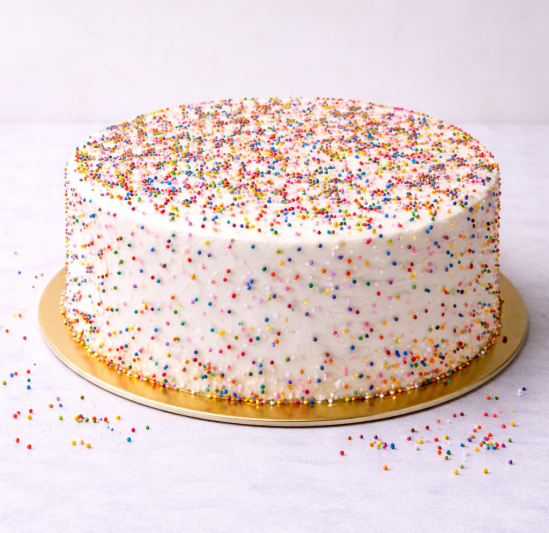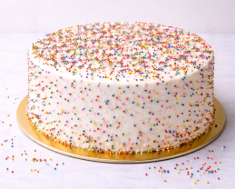 Classic white cake baked with colour confetti. Filled and iced with Vanilla Buttercream
