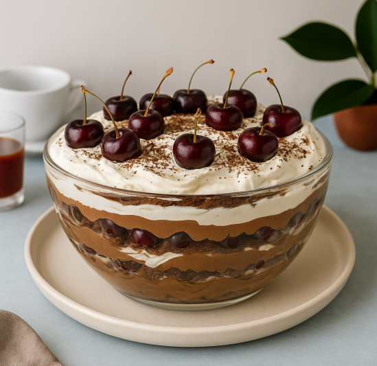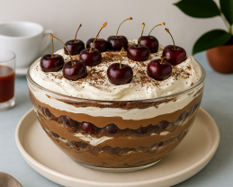 Layers of Chocolate Cake, Cherries and Chantilly Cream.